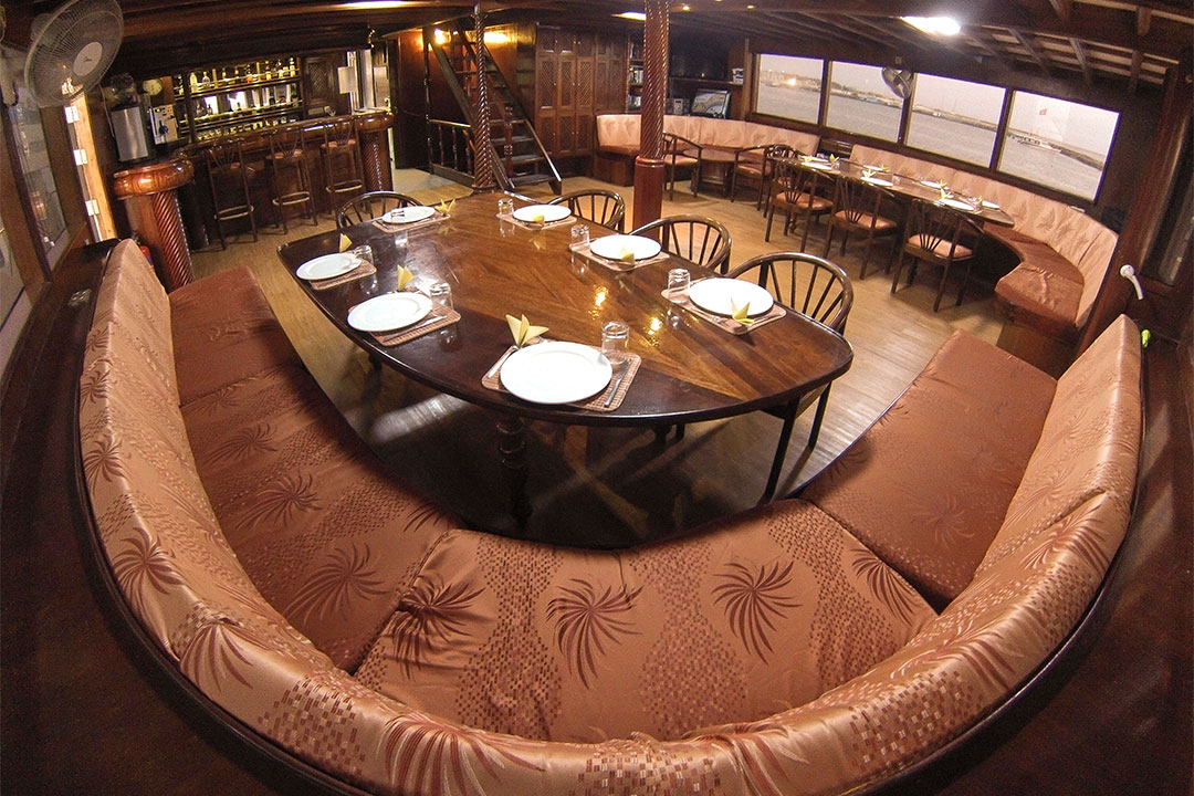 Med sit 20 kvadratmeter store køkken og private kok, vil du med garanti aldrig gå sulten i seng ombord på Amba. Måltiderne er en sammensætning af det internationale og lokale køkken. Er du vegetar, er der også altid 2 vegetariske retter. Hvis vejret tillader det, vil vi en gang om ugen vove os ind på en ubeboet ø og nyde en uforglemmelig grillaften på stranden.