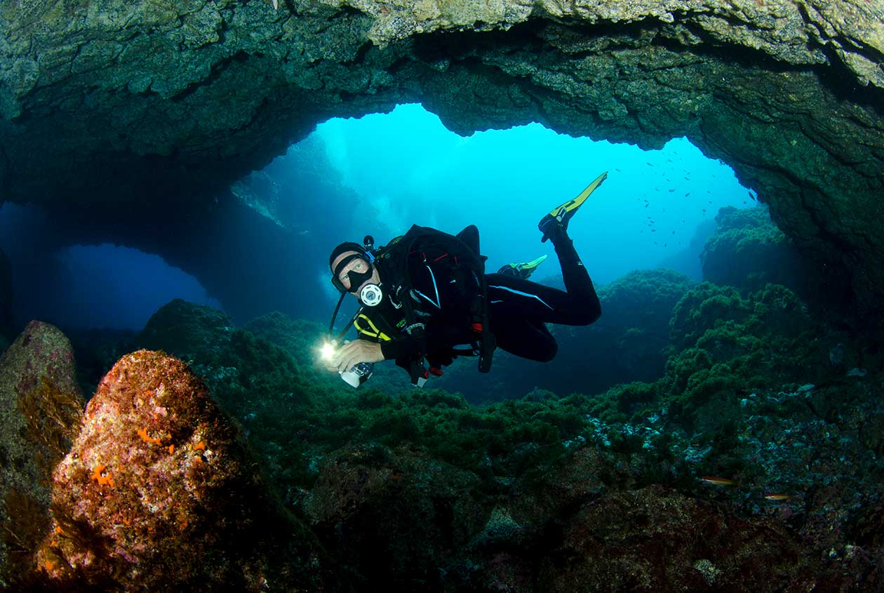Dyk på dybe vægge eller gennem huler og se blæksprutter, rokker og barracudaer