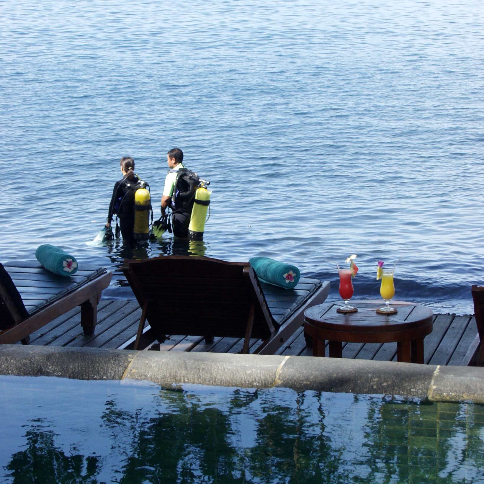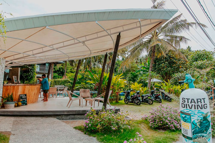 Vores base er en en kombination af Pure Dive Resort som vi dykker med og Ring Sameton Resort hvor vi bor i en stor tropisk have med pool. Resortet ligger lige ved stranden, på det lave vand er der tangfarme, og lige på den anden side af dem, er der gode muligheder for snorkling.