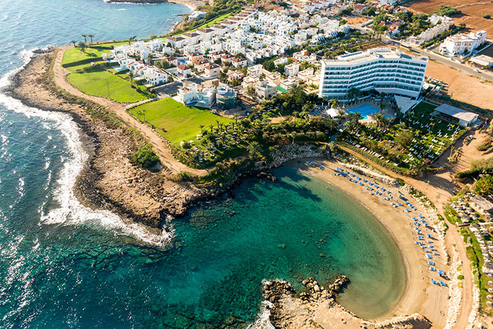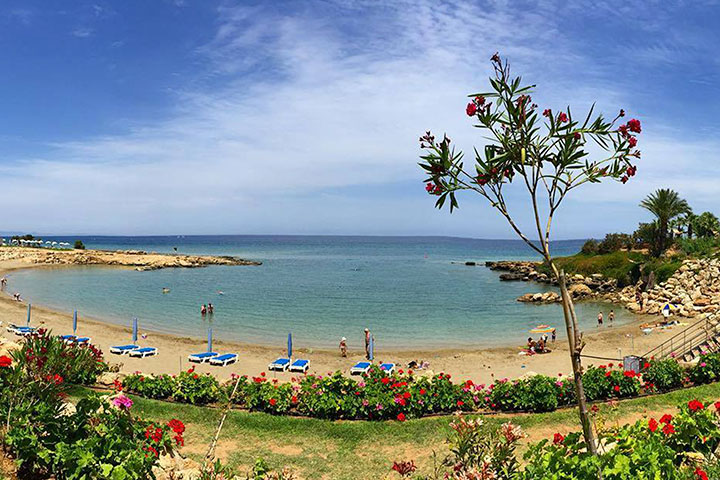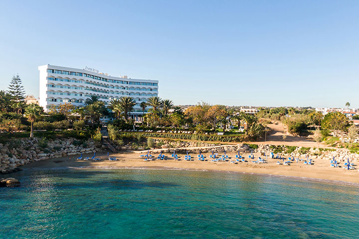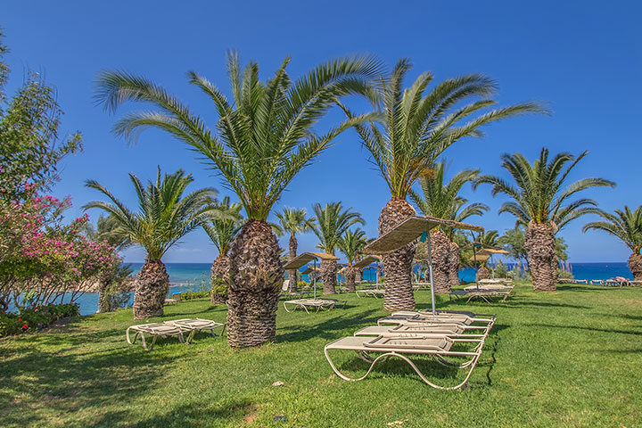 Lækkert Hotel på Cypern, lige på stranden og med poolområde og tropisk have.