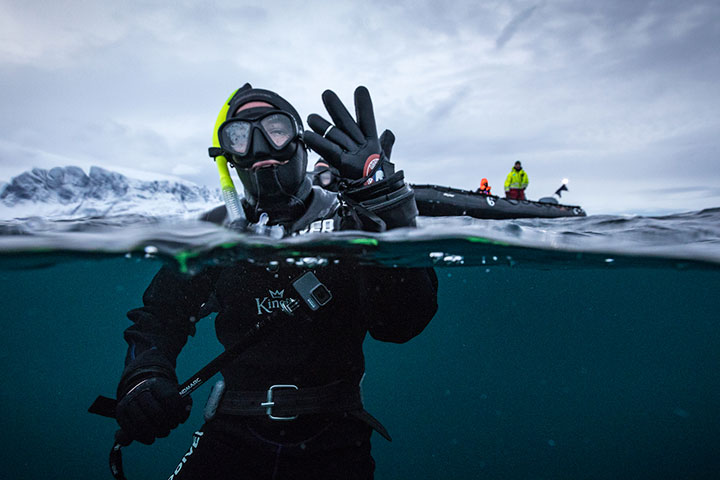 Vandet er omkring 5-7 grader så vi anbefaler tørdragt eller en god 7-9mm fridykkerdragt. Hvis du ikke har din egen kan du enten købe eller leje en igennem Kingfish inden afrejse.