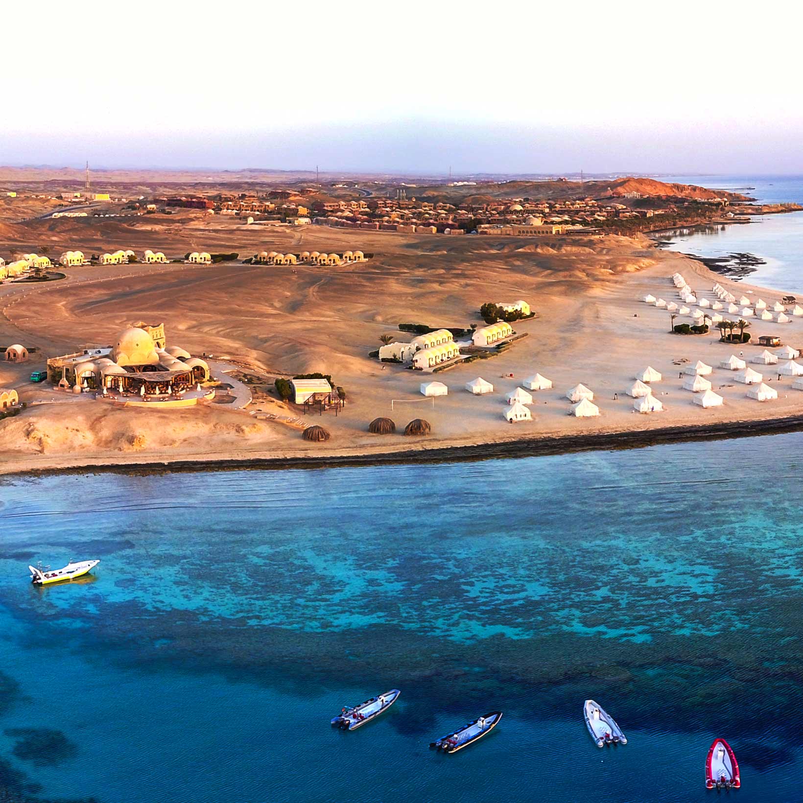 Flotte hytter og Royal beduintelte med havudsigt