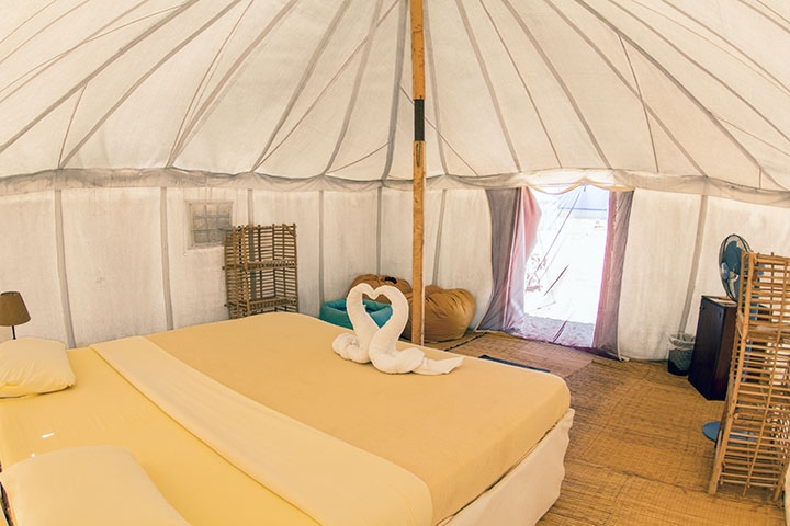 Flotte hytter og Royal beduintelte med havudsigt