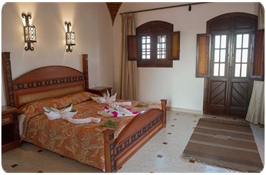 Deluxe chalets er store og pæne og er med eget bad/toilet samt egen terrasse, der deles med naboen. Hertil får du også aircondition og køleskab på værelset som især er god at have i den egyptiske sommervarme fra maj - oktober. Deluxe chalet har samme indretning som hytterne, men også et klædeskab og stole på terrassen. Chaléterne ligger lidt tilbagetrukket i dobbelte bungalows og er bygget med tykke vægge og kuppelformet loft. Tillæg for opgradering fra beduintelt til Chalét A/C er kr. 1.800,- pr. person/uge.