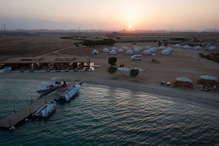 Flotte hytter og beduintelte med havudsigt