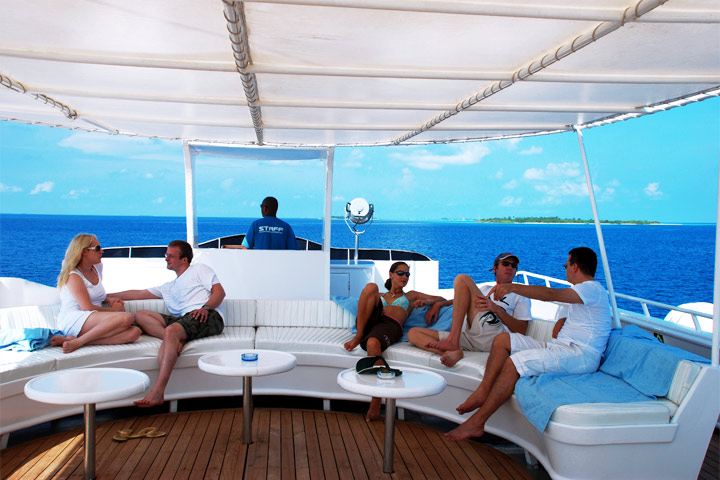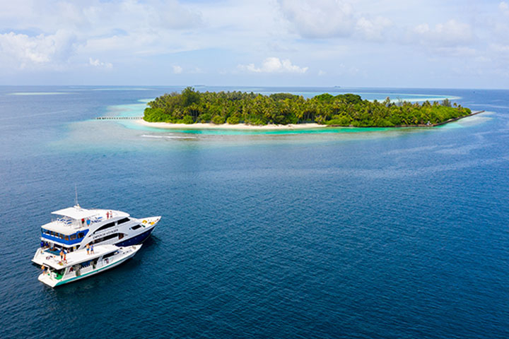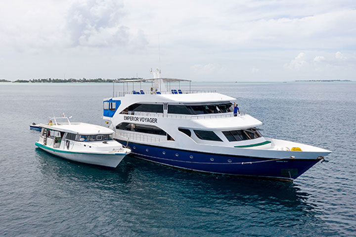 En dykkerrejse til Maldiverne opleves bedst ombord på en liveaboard. En liveaboard giver dig mulighed for mange forskellige dykkersteder på forskellige atoller, så du kan opleve det skattekammer af verdensklasse dykning ø-riget byder på. Det er standard at der er 2 skibe til rådighed. Moderskibet hvor du bor, spiser og kan nyde den afslappede stemning ombord, samt det mindre, eskorterende dykkerskib - Dhoni'en - der fylder dykkertanke på behagelig afstand og fungerer som dykkerskib.