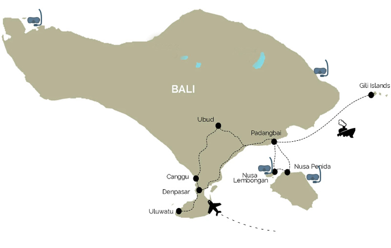 Bali er en eksotisk vulkan-ø, som er 20% mindre end Sjælland og ligger i den sydligste del af Indonesien. Bali består af ca. 14.000 øer, 4,5 mio. mennesker og 250 sprog. Øen er rig på kunst og kultur og kendt for sine frodige regnskov, rige dyreliv, afslappende wellness-oplevelser og selvfølgelig den fantastiske dykning.