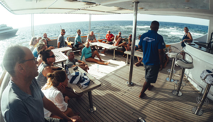 Du vil også blive introduceret til klokken - klokken vil i den tid, du bor på båden, være omdrejningspunktet for dine dagsaktiviteter. Klokken ringer, når det er spisetid, når der er briefing til et dyk, når der skal dykkes og når man skal samles. Nogle gange dykkes der flere steder på samme lokation. Andre gange sejler skibet videre til næste dykkerlokation, når den sidste dykker er kommet op af vandet. Det betyder, at du kan udnytte sejltiden med at slappe af, sole dig på dækket eller dele røverhistorier med de andre dykkere på båden.