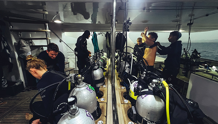 Når du ankommer til båden, vil du blive indkvarteret i din kahyt, hvorefter besætningen og de lokale guider vil holde en briefing om selve turen og livet på båden. Alt dykkerudstyret bliver opbevaret på dækket. Her vil hver dykker få en plads med en kasse og en flaske med det samme nummer. Bly vil blive udleveret, så husk igen ikke at pakke det med hjemmefra. Udstyret sættes op én gang, hvorefter besætningen vil sørge for at påfylde luft i flaskerne mellem hvert dyk. Våddragter kan hænge og tørre uden at flyve af og der vil være en ladestation, hvor man kan oplade sin elektronik. Vær opmærksom på, at de fleste både ikke tillader, at man oplader elektronik i sin kahyt af hensyn til bådens brandreglement.