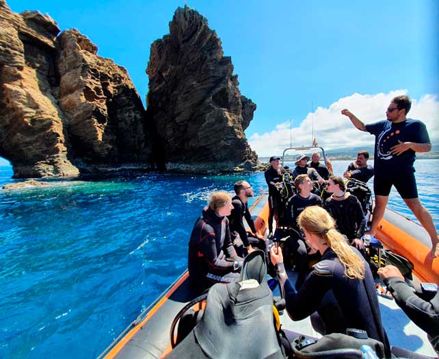 De fleste af vores dyk er på vægge, hvor vi af og til ikke kan se bunden, hvorfor der af og til også er lidt strøm at kæmpe med. Vandet er ca. 20 grader og sigten er virkelig god! På vores dyk ser vi masser af store og farverige fisk fx ravfisk, barracudaer, groupers, aftrækkerfisk og papegøjefisk. Vi ser også muræner, ørne- og pigrokker, en enkelt blæksprutte, hummere, nøgensnegle samt ildorme. Den ene dag har vi også et dyk på et vrag, hvor der er mulighed for dem der ønsker det at svømme ind i vraget. Azorerne skuffer på ingen måde, og har noget for enhver smag.