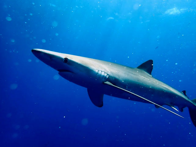 Det er vores første dyk på liner, hvilket vil sige, at der fra båden er kastet fire liner ned i vandet, som vi skal holde fast i for ikke at blive taget af strømmen. Vi får fordelt os på linerne, og så hænger vi bare der, mens blåhajerne svømmer helt tæt på os og ind i mellem os. Jeg er dybt fascineret af hajer, og har helt sikkert øjne så store som tekopper, mens vi hænger der på linerne. Vi har seks hajer, der svømmer rundt om os, og mit hoved flyver rundt for at følge med dem. Vi hænger der på liner midt ude på havet, hvor der er flere hundrede meter dybt, og jeg oplever alligevel en ro, som jeg kun kan få, når jeg dykker. Jeg kunne blive hængende der meget længe, og det ene dyk, vi har med hajerne, er derfor også alt for hurtigt slut igen.