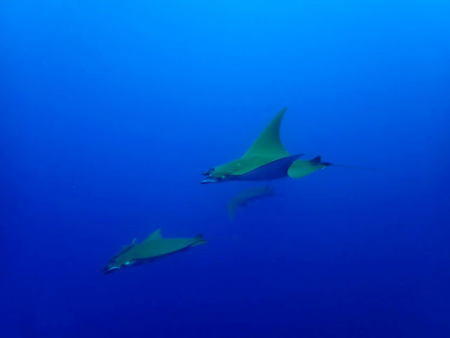 Med et smil på læben kommer vi i udstyret og ned i vandet igen. Knap er jeg nået ned på linen igen, før en kæmpe flok mobula rokker dukker op. Det er nærmest en væg af rokker, der glider forbi. Jeg opgiver at tælle, fordi de er alle steder, men jeg har ladet mig fortælle at de andre stoppede med at tælle, da de nåede 50 dyr. Det er nogle minutter som jeg aldrig kommer til at glemme og som ord aldrig kommer til at kunne beskrive. Vores rejseleder Sigurd beskrev det meget fint, da han i et opslag skrev ”wauw… bare wauw!”.