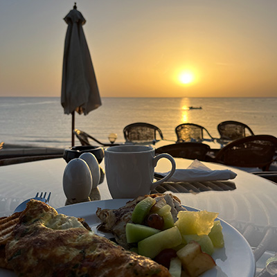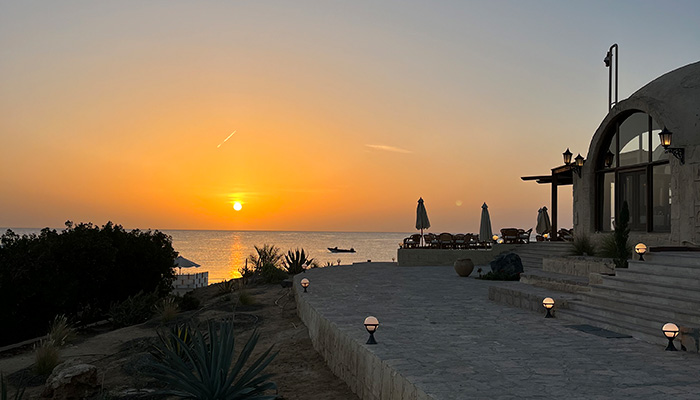 Efter en bustur til Shagra med mange grin og gode snakke med mine nye venner, landede vi langt om længe i noget, som jeg selv i mørke godt kunne fornemme lignede paradis midt i ørkenen. Det blev bekræftet, da jeg vågnede tidligt næste morgen og slog den hvide kanvas-teltdug til side og blev ramt af solstrålerne fra den smukkeste solopgang ud over havet. “Skal du med til morgenmad?”. Straks stod de der, mine nye buddies, og var klar til at gå til morgenmad sammen.