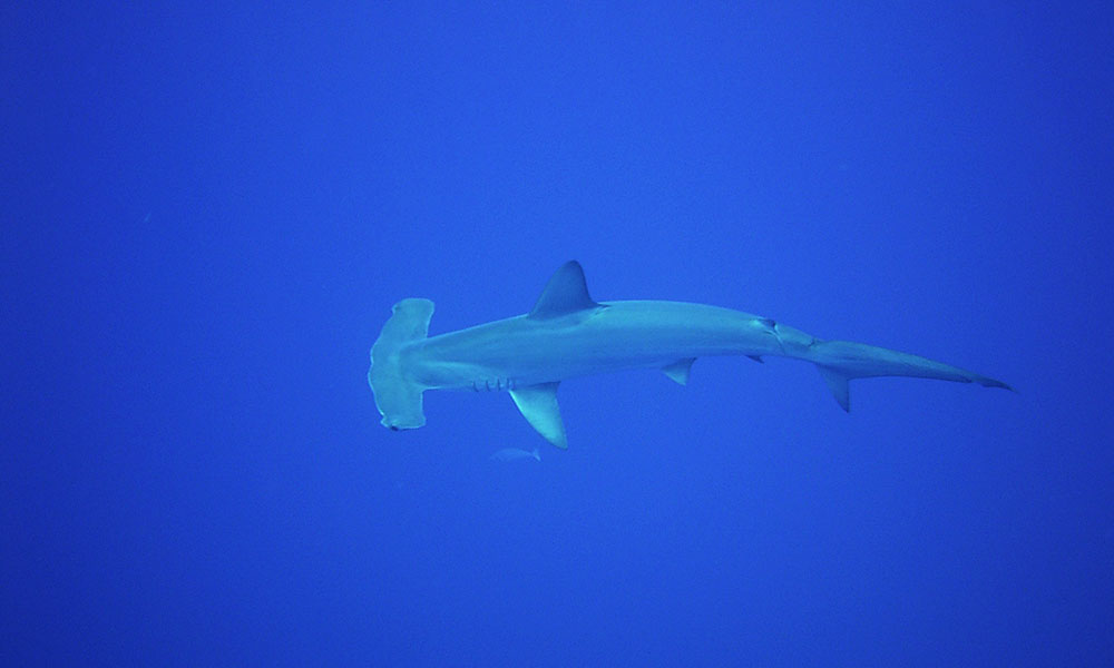 Vi nærmer os 35 meter midt ude i det blå uden et rev i sigte. Vi ligger alle parat og stirrer forventningsfuldt i alle retninger. Minutterne bliver lange, og PLUDSELIG kan vi spotte et par store skikkelser dukke op fra det fjerne blå. Kan det mon være..? Ja, det kan det. De karakteristiske kæmper sniger sig op af dybet og nærmer sig. Begejstringen er svær at skjule, og jeg tror flere af os jubler bobler i det blå. Jeg synker langsomt til 40 m. for at komme endnu tættere på det imponerende væsen – kun min dykkercomputer (og sunde fornuft) begrænser mig i, at følge dem videre ned på deres færden. Vi så dem… Vi så endelig hammerhajer! (Top tip nr. 3: Hav god tålmodighed. De, der venter på noget godt, venter aldrig for længe)