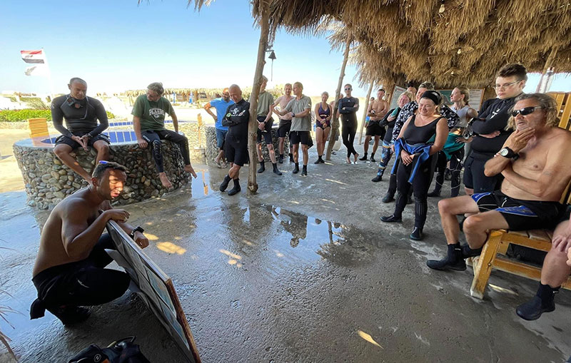 Briefing før afgang til Dolphinehouse. Hele holdet er samlet og klar til nogle fede dyk
