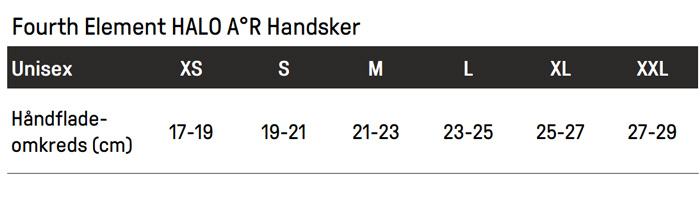 | Håndflade-omkreds (cm) | 17-19 | 19-21 | 21-23 | 23-25 | 25-27 | 27-29 |
