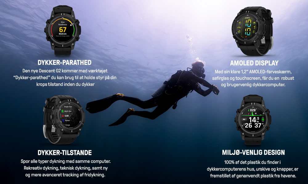 Descent™ G2 kommer med en ny og forbedret AMOLED farve og touch-display, der giver dig en klar og tydelig skærm til aflæsning, både når du dykker og dyrker din aktive livsstil på farten. Dykkercomputeren er designet til dykning på ned til 100 meters dybde (10 ATM) og kan bruges til både rekreativ dykning, teknisk dykning og fridykning. De mange forskellige dive modes (single og multi gas, nitrox og trimix, samt gauge, apnea, apnea hunt og lukket cirkulær rebreather funktion) giver dig mulighed for at bruge Descent™ G2 til alle former for dykning og fridykning.