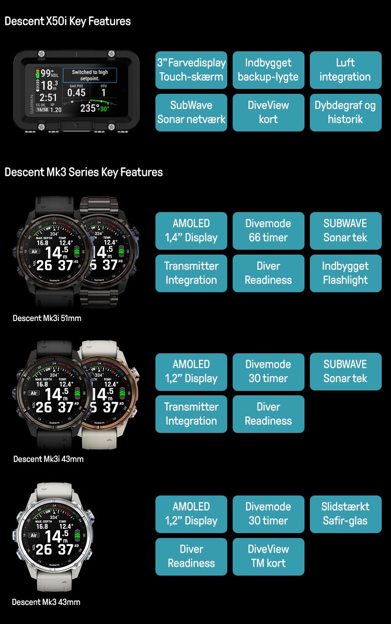 - Diver Readiness: Værktøjer er udviklet af Garmin og fortæller dig, baseret på data omkring din søvn, træning, stress og jetlag) hvor klar din krop er til at dykke.