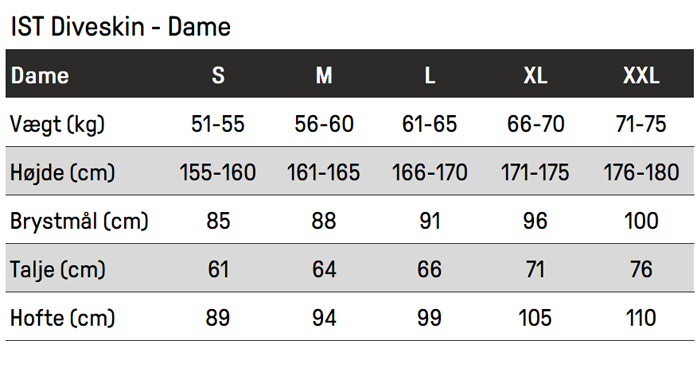 IST Diveskin er en jumpsuit med front lynlås, som giver alle de fordele som en rashguard har. Det er nemt at komme i våddragt, du får beskyttelse mod forskellige irriterende vandorganismer såsom brandmænd osv. IST diveskin er lavet i 82% polyester og 18% spandex som giver extra komfort samtidig med den tørrer superhurtigt når du er oppe af vandet. Hvis du dykker i troperne, hvor vandet er varmt nok til at dykke uden våddragt, så kan dette være et godt bud - fordi dragten næsten ingenting vejer eller fylder (kan krølles sammen til en stor håndfuld) - og giver beskyttelse mod skadelige organismer under vand.