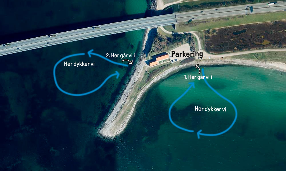 Du kan holde på parkeringspladsen ved Isbådsmuseet. Gå herfra enten ud til vestsiden ved broen, eller tag turen på østsiden i bugten. Du kan altså med andre ord få to forskellige dyk på samme dag!