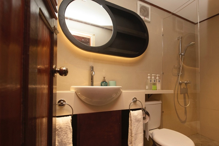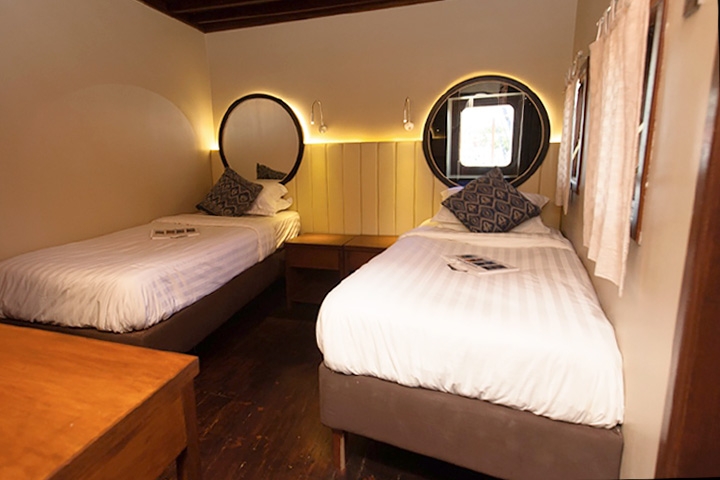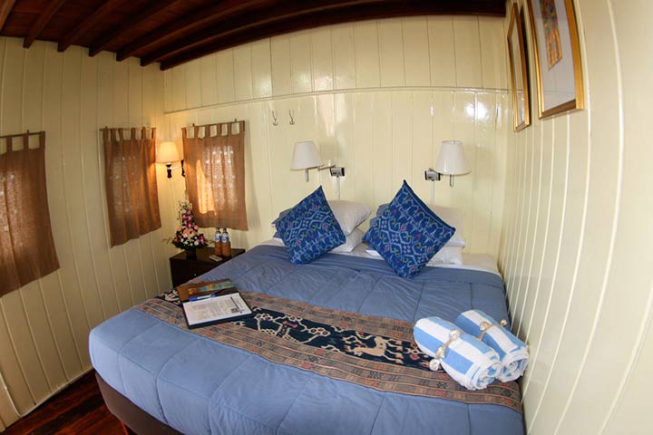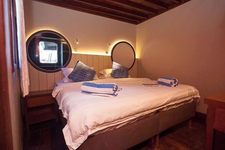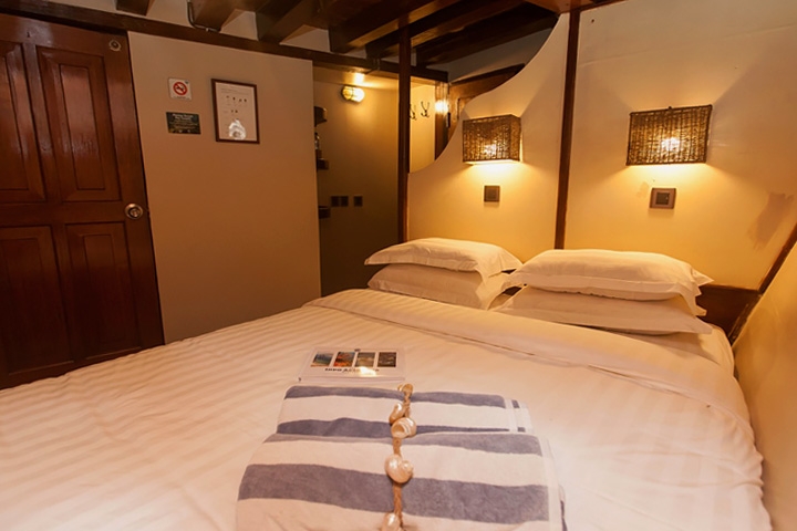 2 Master Staterooms på øverste dæk med havudsigt og en dobbeltseng eller to enkeltsenge; 2 Deluxe Staterooms på nederste dæk med en dobbeltseng og koøje; 4 Twin Staterooms med køjeseng med to enkeltsenge og koøje. Alle kahytter har eget bad/toilet, individuel a/c, badekåbe, hårtørrer og får skiftet håndklæder flere gange på ugen.