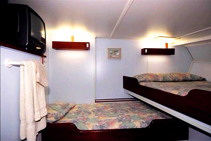 Alle har 1 enkeltseng og 1 dobbeltseng såvel som a/c & TV/DVD. 8 kahytter har eget bad/toilet, mens 3 kahytter deler 2 bad/toilet.