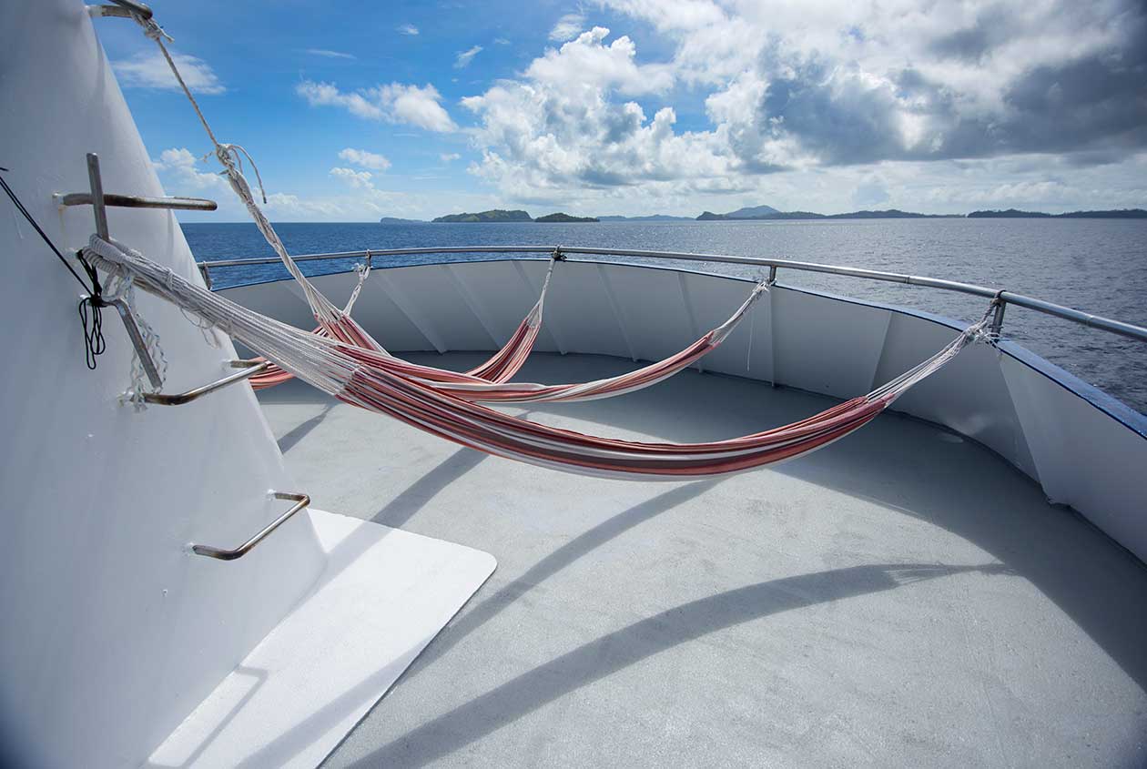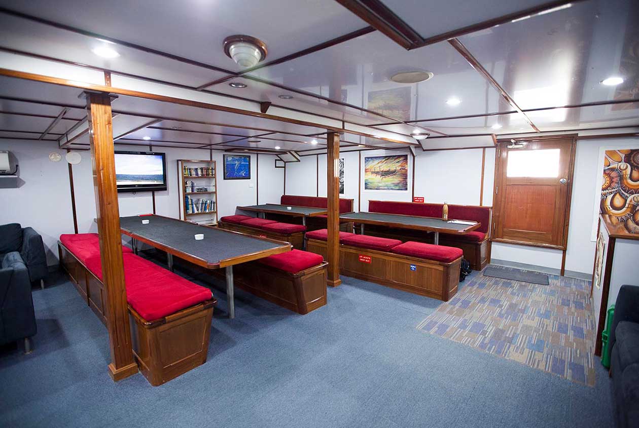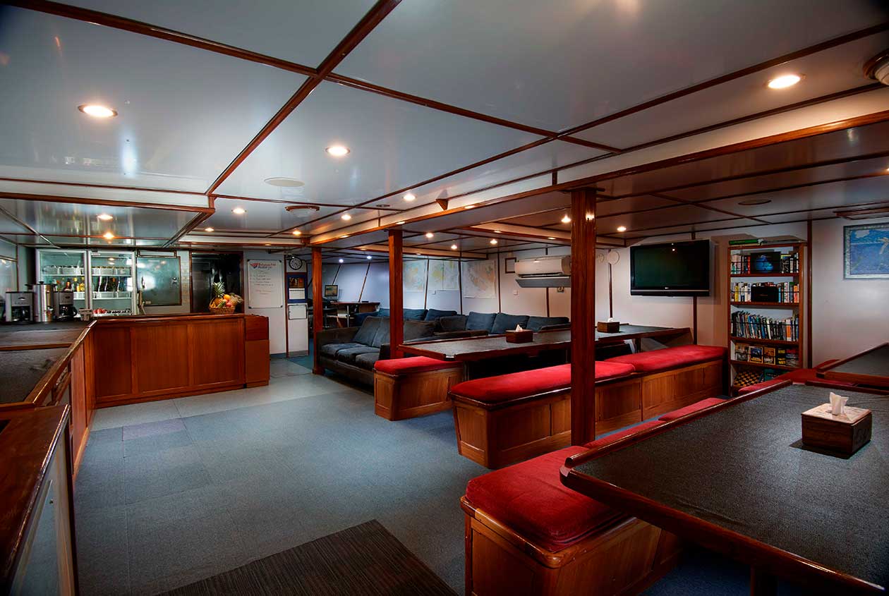 På hoveddækket ligger den meget store indendørs lounge & spisesalon med aircondition og bar. Her er også TV/DVD og sofaer så du kan slappe af til en film, eller se dagens foto/video optagelser. På de to øvre dæk er både et overdækket opholdsområde med loungers, et chillout område med hængekøjer og et stort soldæk med behagelige liggestole hvorfra du kan nyde den smukke udsigt til øerne i Truk Lagoon.