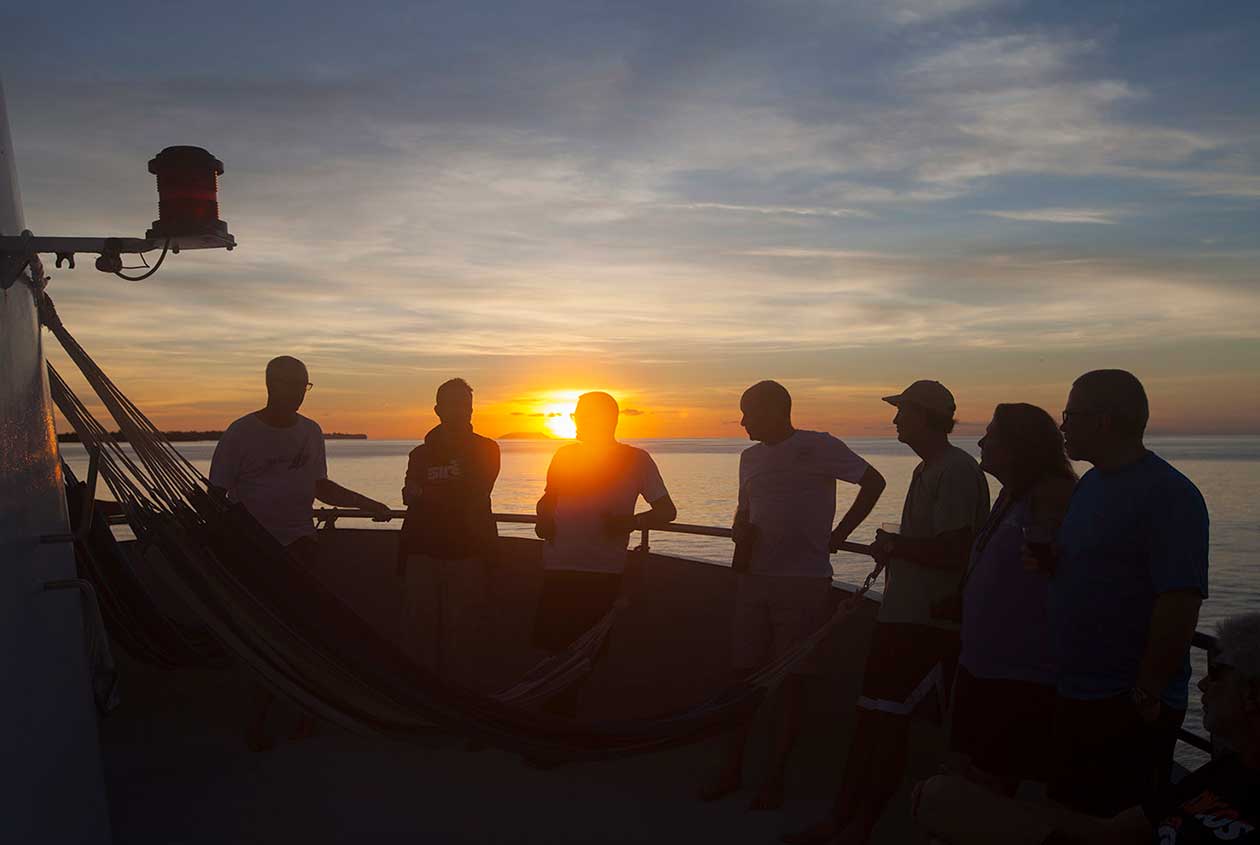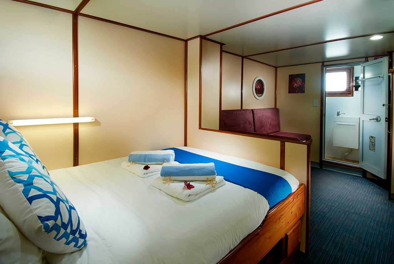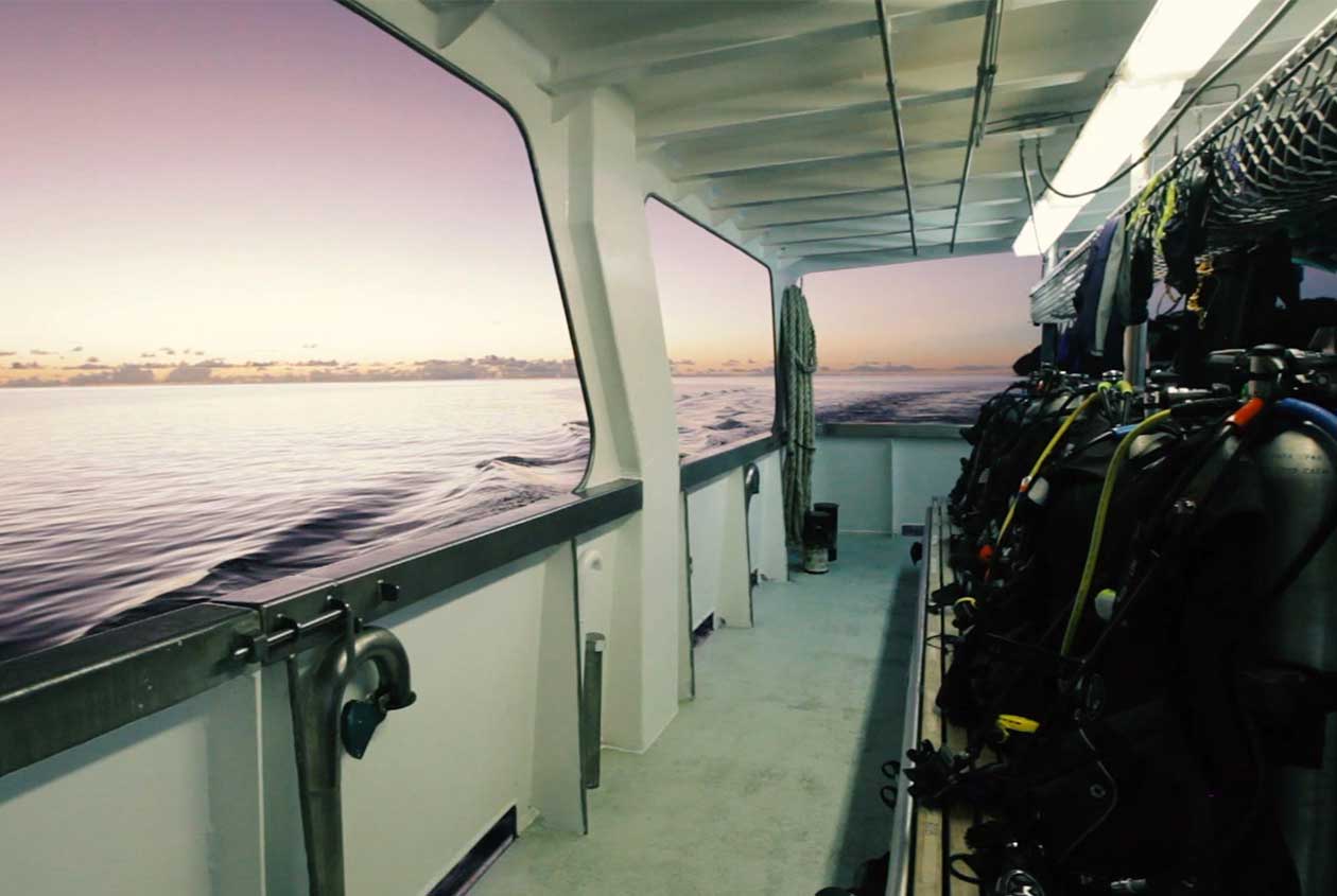 På hoveddækket ligger den meget store indendørs lounge & spisesalon med aircondition og bar. Her er også TV/DVD og sofaer så du kan slappe af til en film, eller se dagens foto/video optagelser. På de to øvre dæk er både et overdækket opholdsområde med loungers, et chillout område med hængekøjer og et stort soldæk med behagelige liggestole hvorfra du kan nyde den smukke udsigt til øerne i Truk Lagoon.