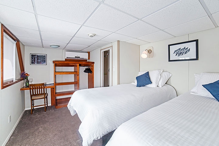 På nedre dæk finder du seks 2-mandskahytter, to dobbeltsengskahytter samt én triplekahyt med enkeltsenge. Alle de gode kahytter har eget bad og toilet. Derudover har de alle koøjer og er udstyret med a/c og hylder, hvor du kan opbevare dit tøj.
