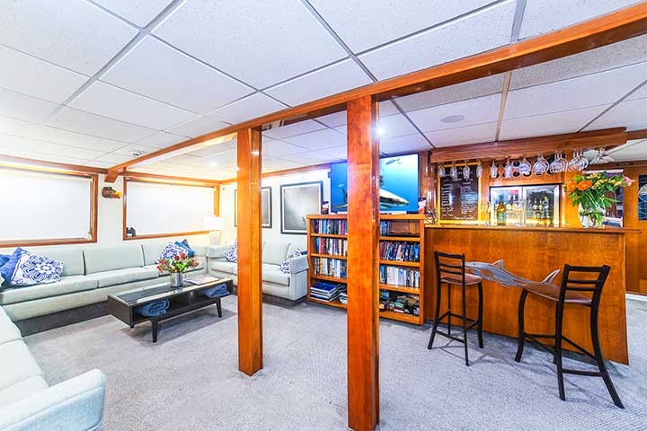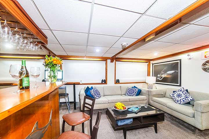 I loungen på hoveddækket er der bløde møbler, et stort bibliotek samt bar. Her er der således gode muligheder for afslapning. I loungen kan du også se film eller dele billeder fra dagens dyk med de andre ombord.