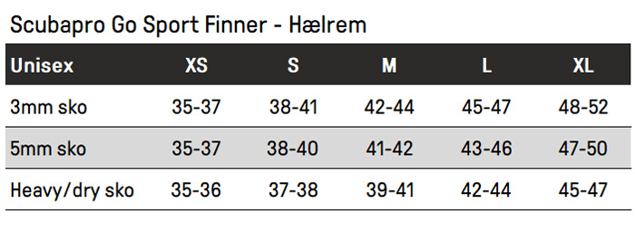 | Scubapro Heavy sko | 35-36 | 37-38 | 39-41 | 42-44 | 45-47 |