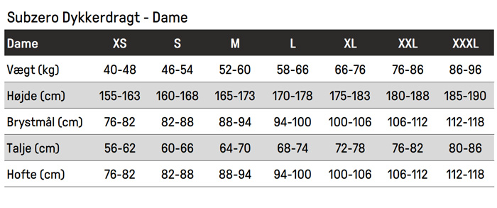 Størrelsesguide: Subzero Dykkerdragt Kvinder