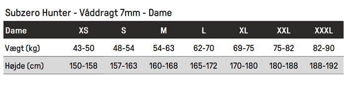 Størrelsesguide: Subzero Hunter 7mm våddragt