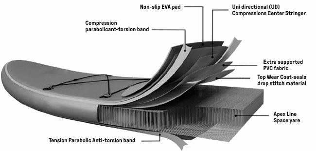 Når man køber et SUP Board, kan man ikke se hvordan det er opbygget indvendigt, men det har stor betydning for stivheden og dermed fremdrift og stabilitet. Alle Subzero SUP Boards er bygget op omkring en ALSY teknologi (Apex Line Space Yare) som sikrer ekstra stabilitet og stivhed i boardet.