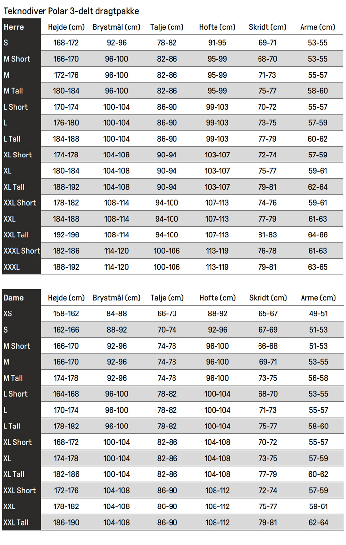 Når du vælger størrelse på våddragten, kan du vælge mellem 15 forskellige størrelse. Skulle der alligevel ikke være en størrelse der passer, kan man med stor fordel vælge at få våddragten målsyet og syet efter dine nøjagtige mål.