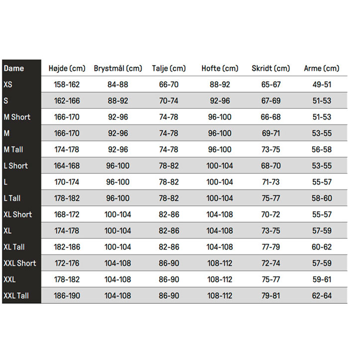 Når du vælger størrelse på våddragten, kan du vælge mellem 15 forskellige størrelse. Skulle der alligevel ikke være en størrelse der passer, kan man med stor fordel vælge at få våddragten målsyet og syet efter dine nøjagtige mål.