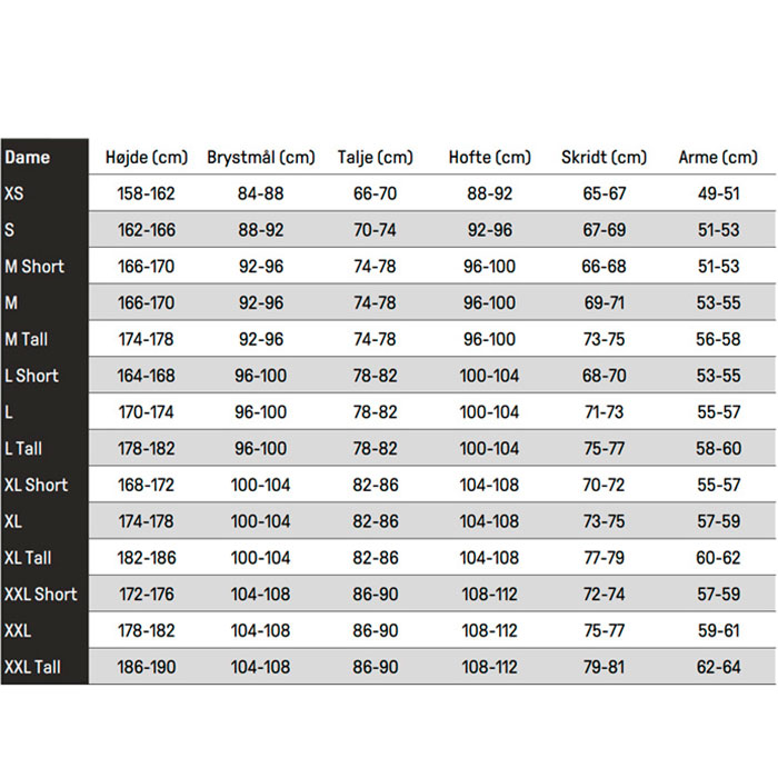 Når du vælger størrelse på våddragten, kan du vælge mellem 15 forskellige størrelse. Skulle der alligevel ikke være en størrelse der passer, kan man med stor fordel vælge at få våddragten målsyet og syet efter dine nøjagtige mål.