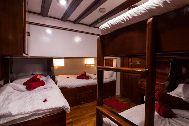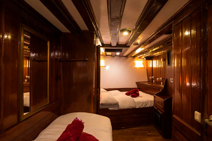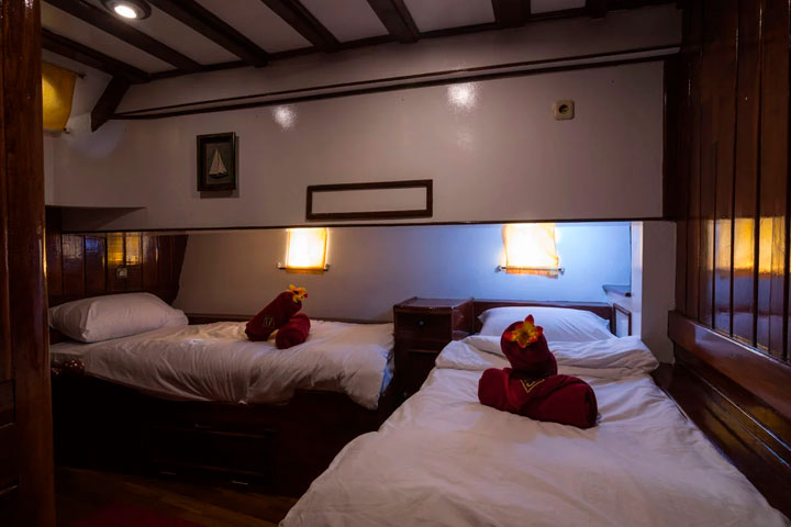 Der er i alt 7 velindrettede kahytter der alle ligger på nedre dæk med koøje og som alle har eget toilet/bad og er udstyret med individuelt styret air-condition. Heraf 5 tomandskahytter med to enkeltsenge hvoraf 3 af disse kahytter også kan laves med en dobbeltseng. Dertil findes 2 større firmandskahytter med fire enkeltsenge. Hver kahyt har private læselamper, pengeskab og skabe til opbevaring.