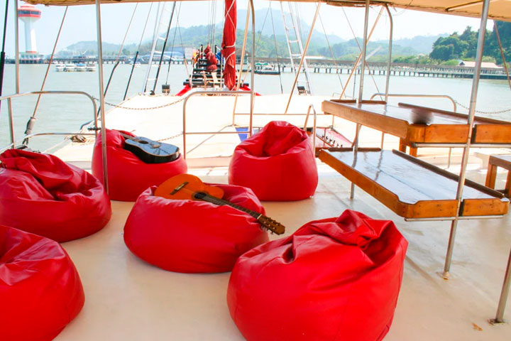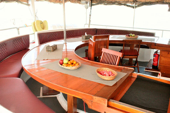 Øverst på båden finder du et delvist overdækket område med borde, stole, madrasser og puder, og også her, er der rig mulighed for afslapning imellem dykkene og med flot havudsigt.