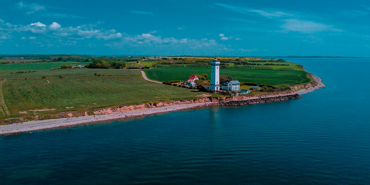 Der går en sti forbi fyrtårnet og en trappe videre ned til diget. Du kommer i vandet til højre efter rullestenene.