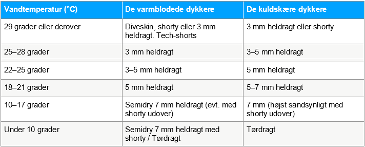 Tykkelse og type afhænger af individuelle præferencer og hvor kuldskær man er. Nogle foretrækker måske en 3 mm shorty, mens andre har brug for en 5 mm heldragt for at holde varmen. Det er bedre at have en dragt, der er lidt for varm, da man kan åbne i halsen og lukke lidt vand ind, end at fryse under et dyk. Ved længere ture på en RIB (Zodiac, Dingy eller andet) skal man også overveje afkøling fra vinden på vej hjem. Neopren absorberer kropsvarme, når det tørrer, så det er en god idé at trække dragten ned over skuldrene og tage en trøje på mellem dyk, eller tage dragten helt af.