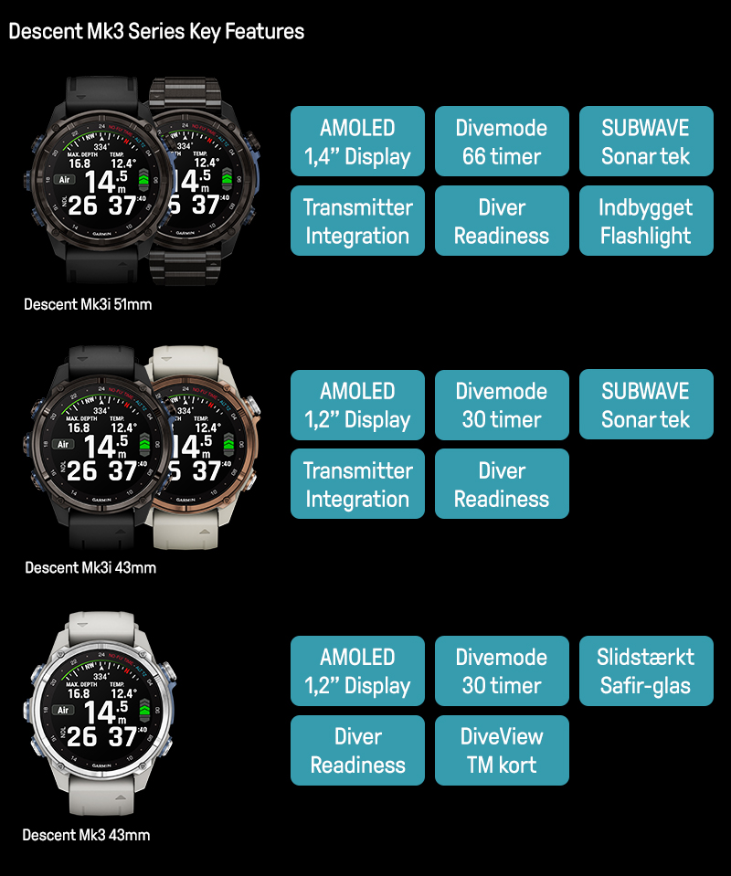 Med Garmins dykkercomputere Descent™ Mk3 og Mk3i, får du mulighed for at udvide dine kompetencer og rykke dine grænser for, hvad der er muligt for dig som dykker. Uanset om du dykker med tank, fridykker, snorkler, svømmer, dyker Paddleboard, surfer, løber, spiller golf eller står på ski, er Garmin Descent™ Mk3 og Mk3i din bedste makker, til den aktive livsstil.