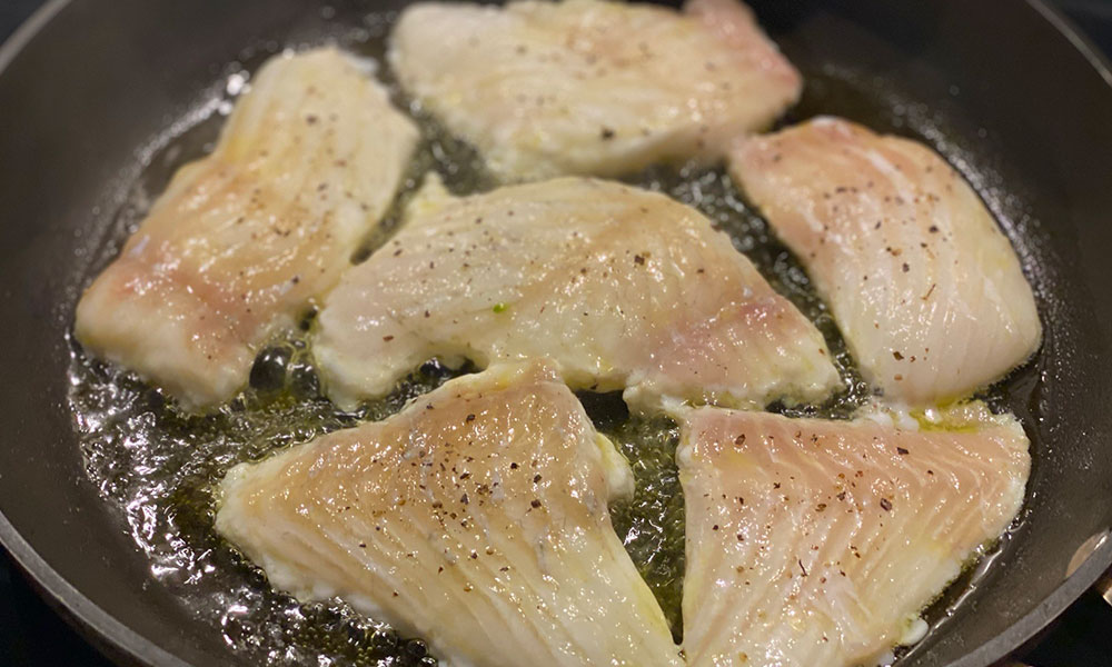 - Varm oliven olie på panden og steg fileterne i ca. 3-4 min. på den ene side, efter 2 min tilsætter du smør til stegning.