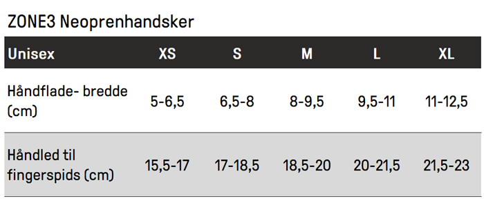 Størrelsesguide: ZONE3 Neoprenhandsker